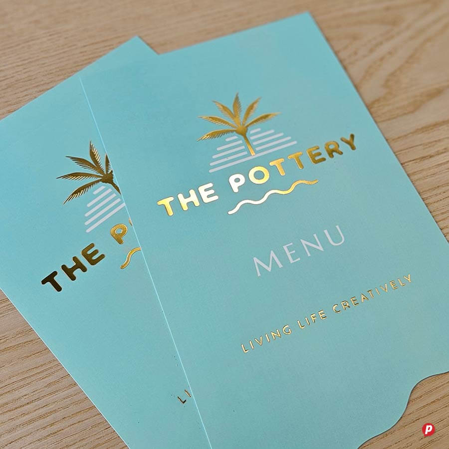 Hot Ink logo on a turquoise menu card for The Pottery, featuring a palm tree and modern design.