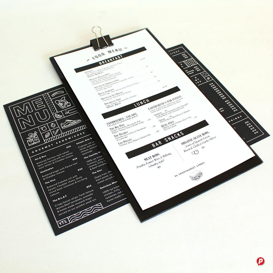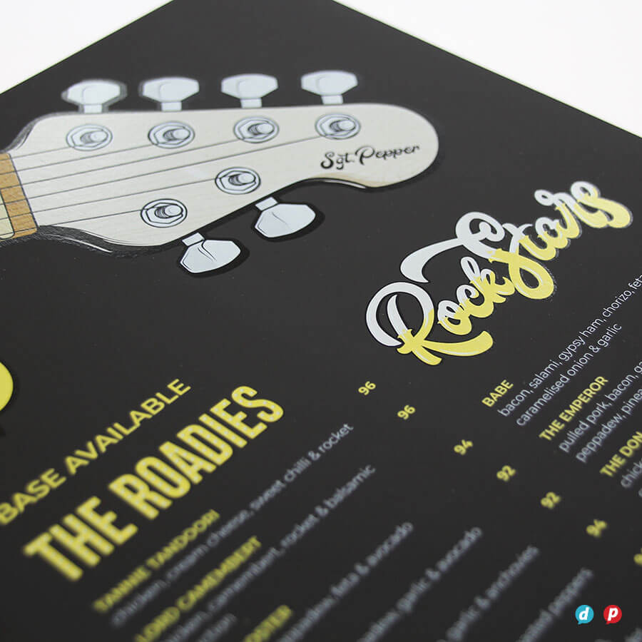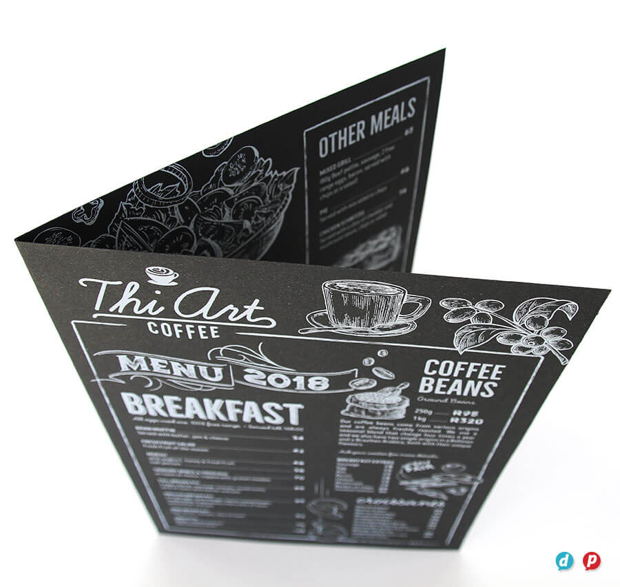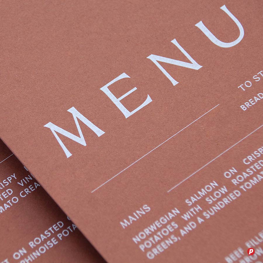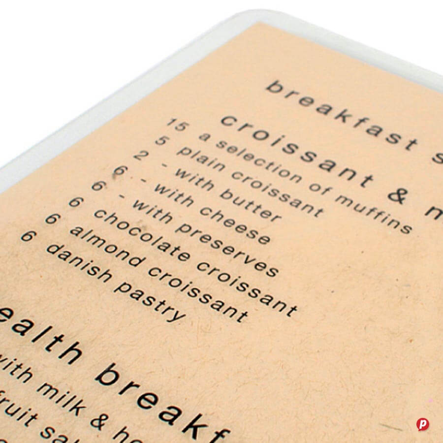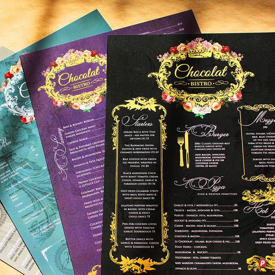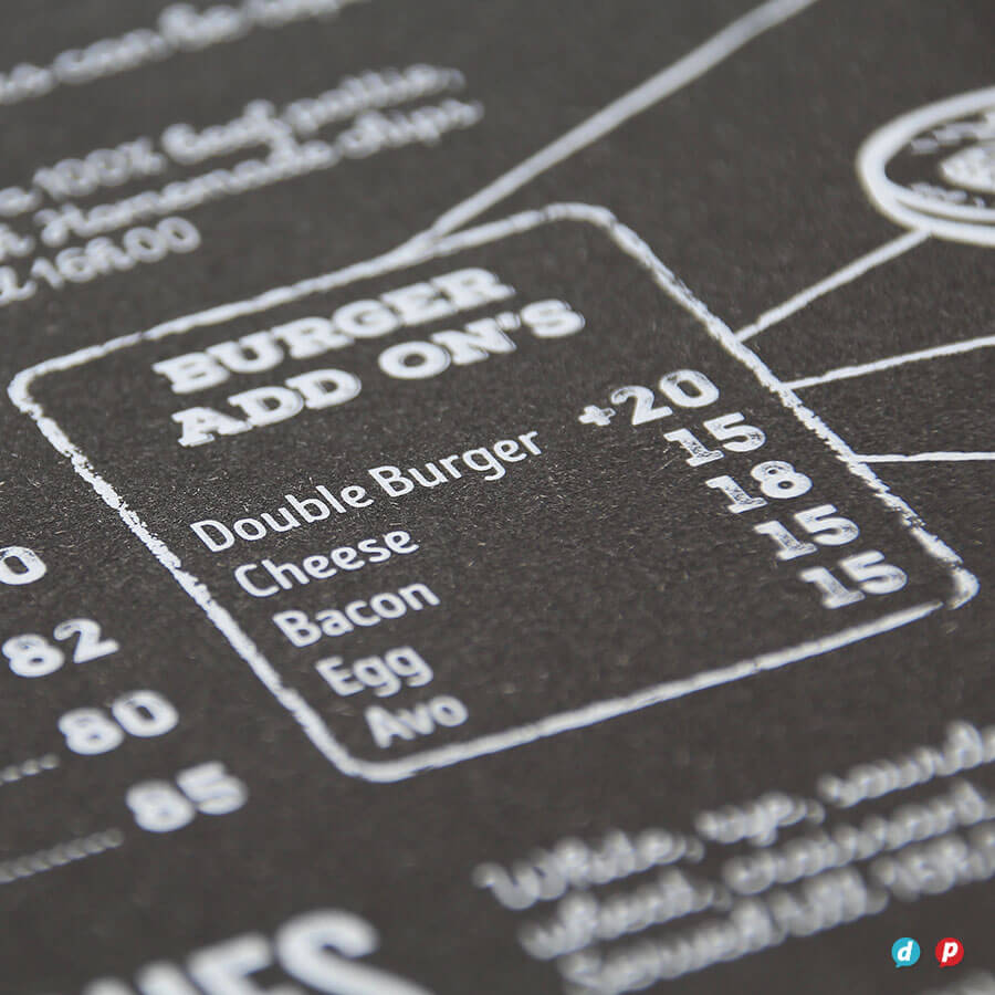 Our hands-on approach delivers unique menu solutions tailored to your specific needs and marketing budget. Our in-house special finishes include lamination, die-cutting, metallic gold and silver printing, as well as two unique features: opaque white ink and extra length sheets (up to 1000mm long!).